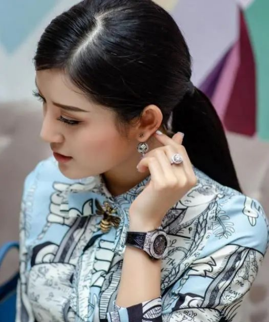 另外一张活动照中,HuyenMy身穿一身蓝色立体印花连衣裙,头发扎成低马尾在脑后,看起来精致干练。从侧脸看去,HuyenMy的五官十分立体,淡淡的妆容更显优雅的气质。再加上精致的球星耳坠,时尚的机械手表,闪耀的钻戒,一身穿搭,格外吸引大家的眼球。