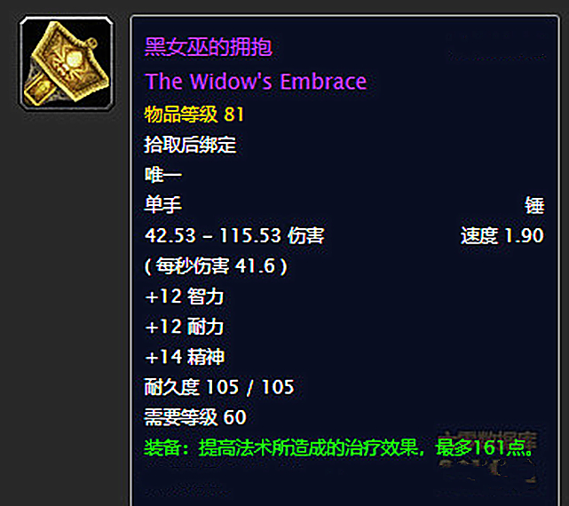 黑女巫的拥抱: +12智 +12耐 +14精神。装备:提高法术和魔法效果所造成的治疗效果,最高161点