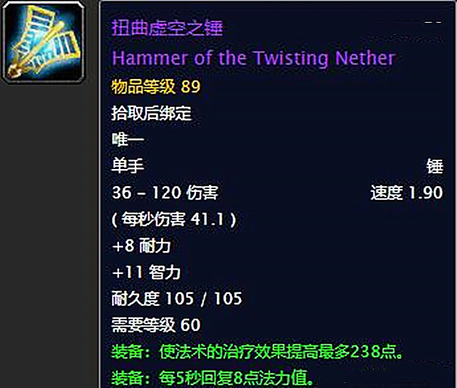 扭曲虚空之锤: +8耐 +11智。装备:提高法术和魔法效果所造成的治疗效果,最高238点;每5秒回复8点法力值