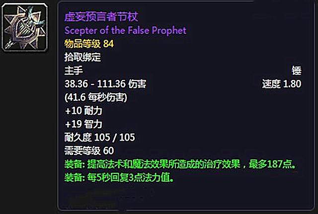 虚妄预言者节杖: +10耐 +19智,装备:提高法术和魔法效果所造成的治疗效果,最高187点;每5秒回复3点法力值