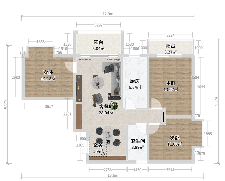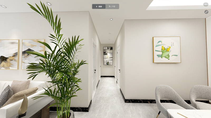 绿色的植物给空间带来许多生机,这盆散尾葵成为了空间的点睛之笔,装饰环境的同时,还能缓解屋主烦闷的心情。走廊两边是卧室、厨房及卫生间,尽头处一幅北欧风格的挂画装饰,显得没有那么空旷。