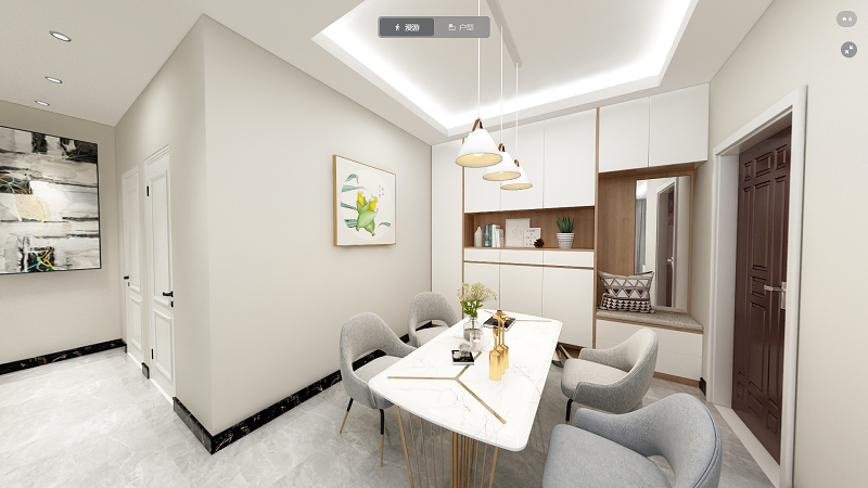 整个餐厅没有复杂的元素,简单的北欧风格装饰画丰富空间内容,归家如同回到一片安静祥和的港湾,让人轻松又自在。餐边柜设立在客餐厅的连接处,采用与玄关柜一样色调的柜子设计,上半部分作为展示用,具有很好的观赏性。