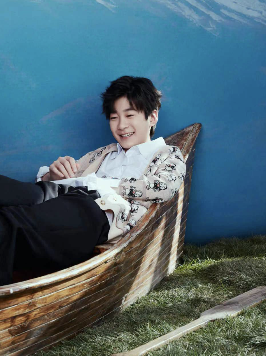 另一张大片中的天天就有些小时候在《爸爸去哪儿》节目中的感觉了,他窝在一艘小船里,露出灿烂的笑容,他的眼睛弯成一道月牙,嘴角上扬,露出一排整齐的牙齿,像极了他小时候参加节目时,和弟弟妹妹们嬉笑打闹时的模样,让人梦回《爸爸去哪儿》时期。