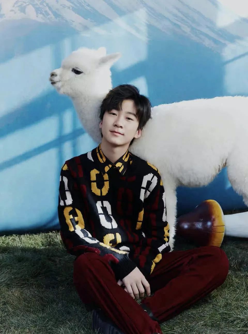 天天穿着黑色字母毛衣,搭配深红色裤子和黑色马丁靴,头发梳成精致的小斜分,整个打扮大方爽朗。他靠在一只羊驼身上,双手随意地交叠在膝盖上,一双无处安放的大长腿格外吸引眼球,连画面都放不下了。细看天天现在的长相越来越像爸爸张亮了,小表情也和张亮格外相似。
