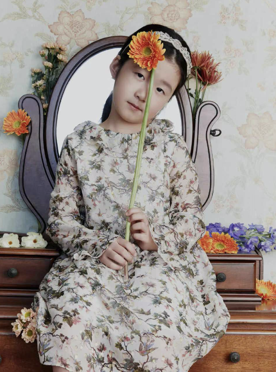 另一张大片走的是小公主风,妹妹穿着碎花连衣裙,黑发扎在脑后,配上了一条蕾丝发带,她坐在一面插满鲜花的镜子前,手里拿着一只橙色的非洲菊。就算是如此温柔的设定,妹妹的小表情也是酷酷的,肉嘟嘟的脸上带着如此冷淡的表情,让人觉得妹妹格外有气场。才6岁,就拥有这样强大的气场,实属不易啊。