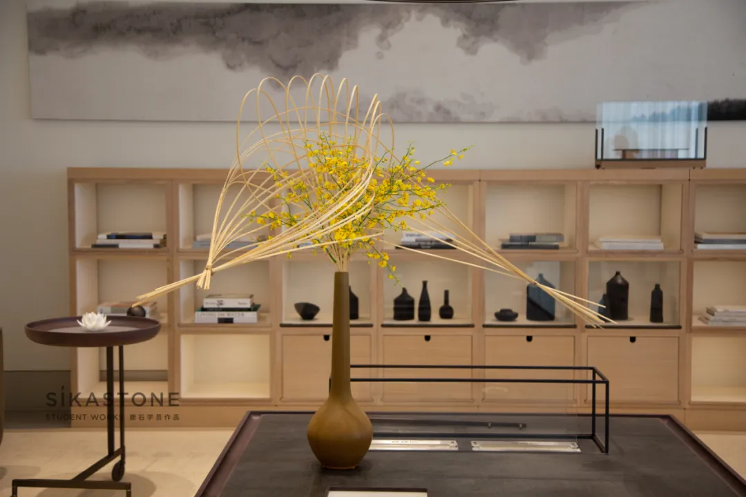 想必已经上过课的同学们一定对此有着深刻的感悟,一个可以表达情绪、描绘意境的东方插花作品,根据不同空间对细节处进行调整,便可以与周遭环境相融,强化空间的雅致气韵,达到最佳的装饰效果。