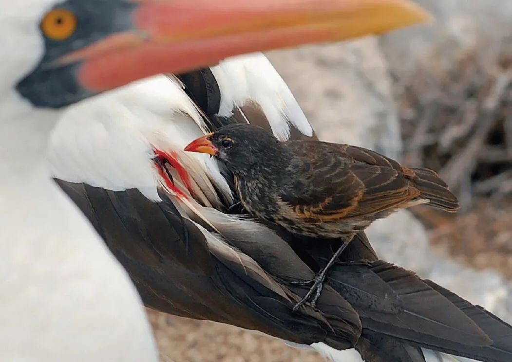 虽然吸血地雀和花园里的小鸟长得差不多,但一听名字你就想躲远一点。它们虽然身型娇小,但猎物是体重比它大50倍的鲣(jiān)鸟,它们会直接跳到鲣鸟的背上,用锋利的喙啄穿其皮肤,疯狂吸食喷洒而出的血液。早期的吸血地雀以种子和昆虫为食,然而在尝到海鸟血液后,便逐渐演化成了“吸血鬼”。