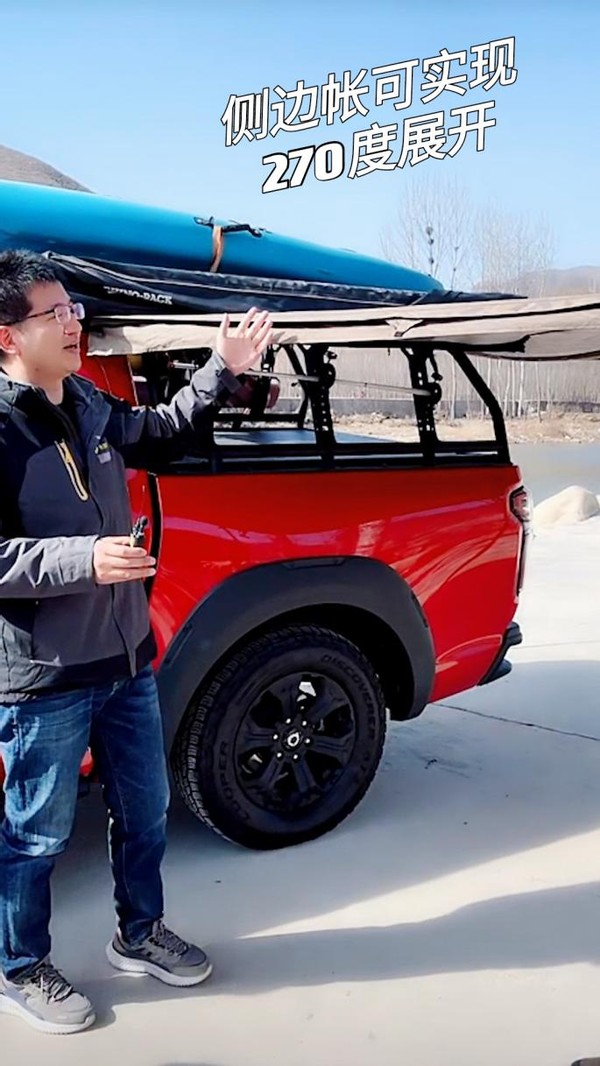 直播刚开始,主播大何老师就迫不及待地讲解起了长城炮野钓版,通过他的介绍我们可以了解到,这辆改装车型的车身侧面配备了来自澳洲的犀牛侧边帐,可实现270度展开,在野外钓鱼时可为用户提供更大的遮阳面积,提高野外用车的舒适性,同时覆盖了后斗抽板的操作区域,使用户可以自由地在天幕下使用冰箱或钓箱。
