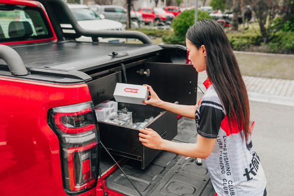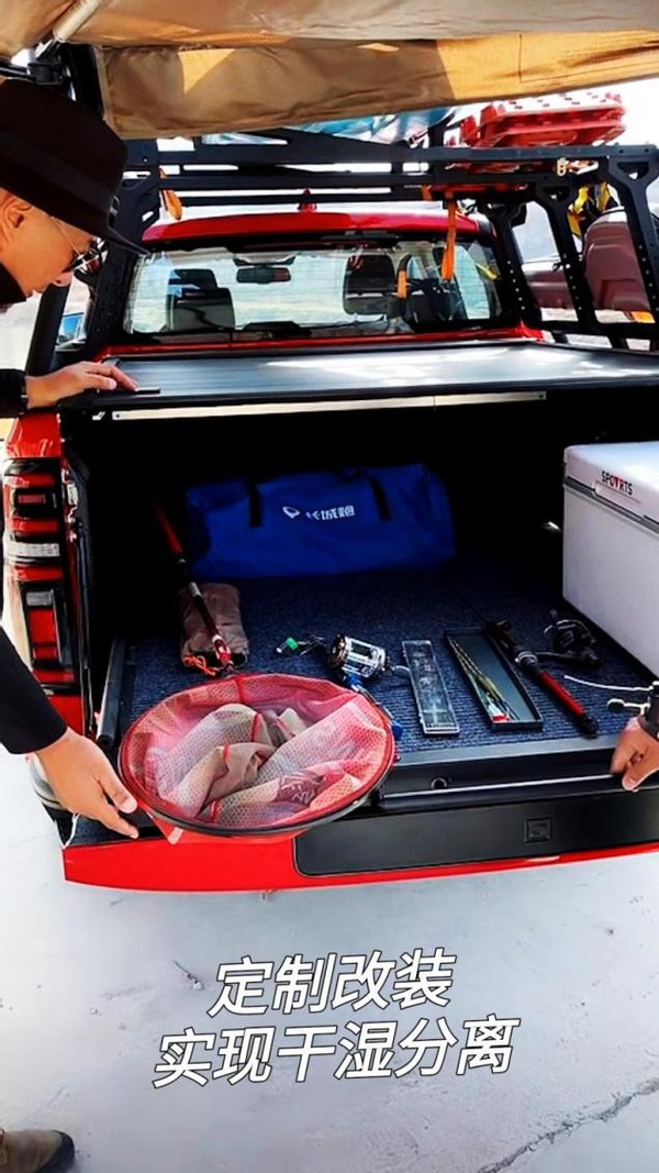 钓鱼发烧友可能都有过这样的烦恼,平时带着钓竿、水桶、抄网等装备钓鱼时,家中的普通SUV很难一车装下,更恼人的是,车中留下的鱼腥味久久不能散去。对此,长城炮野钓版给出了可靠的解决办法,它的超大货箱能够轻松容纳渔具,并且实现干湿分离。其将货箱改装为滑轮抽屉式隔断储物仓,这样就能将渔具和鱼获分类放置,让繁多的钓鱼用具井井有条,鱼线缠绕、泥水溅洒污染货箱等情况便不会再发生。使用时,只需将抽屉拉出即可,即便是放置在最深处的工具也能轻松拿取,十分便捷。