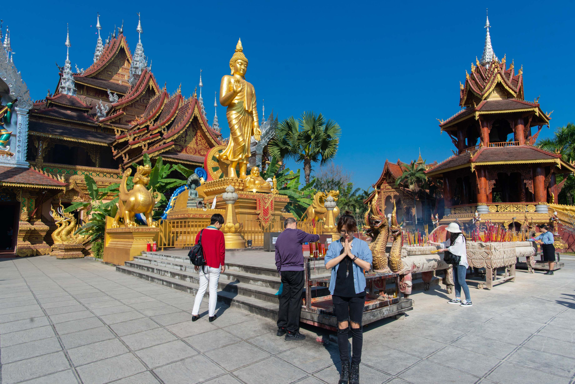 园中还有很多特色又古朴的建筑。正中的主殿,从不同的方向看竟可以形成四种截然不同的建筑。主殿的前面有一座高大的金佛,金佛满脸慈祥地凝视前方,好似在宽慰前方祈求的信子信女们。