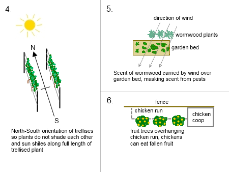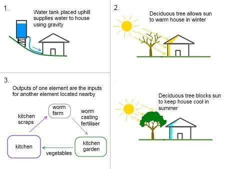 菜园可位于靠近厨房后门的附近,以便在准备餐饮时可以轻松取用植物。在这里,菜园的产出(食物)就是厨房的需求。厨余可以方便地放入靠近菜园的蚯蚓床。厨房的产出(厨房残渣)是蚯蚓床的需求。蚯蚓堆肥为菜园提供了营养丰富的肥料,有助于菜园的生长。蚯蚓床的产出(堆肥)帮助菜园提供了需求。如你所见,所有需求和产出在这三个元素之间都链接在一起,因此没有浪费,并且可进行永续回收过程。