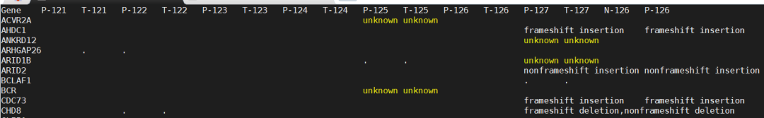mat<-Replace(mat,from = "nonframeshift deletion,frameshift deletion",to = "frameshift_mutation",pattern = "")