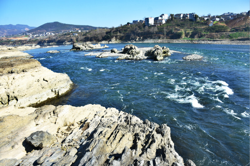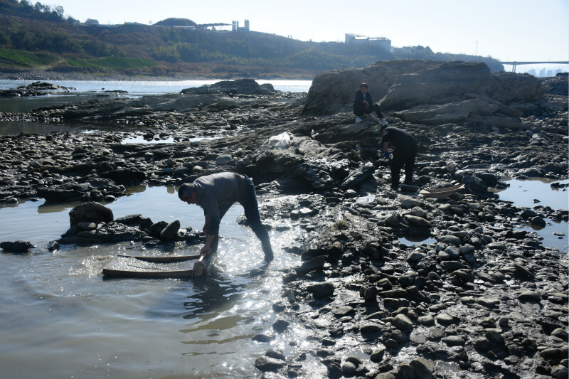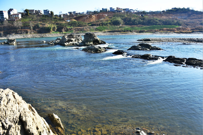 汉江河床里从古至今产黄金,淘金的人有不少呢。淘金的人都是附近的乡村人,而且是土法淘金。我同淘金的人交谈闲聊,才懂得了淘金也是需要淘金知识和技能的。淘金的人大约有三十五六岁,他说这里淘金只能是人工的,机械无法使用。我问一天收获如何,他说运气好一天可以淘金六七克、运气更好的人一天偶尔能淘金十多克呢,当然运气差的一天说不定一克金子也淘不到哩。我谢谢他介绍如何淘金,我们三个人顺着汉江裸露的河床慢慢行走和拍照。高西岐忙碌着为我们拍摄合影,我则忙碌着拍摄裸露的河床的整体图片,结果是没有拍摄到满意的图片,只能在欣赏和观看里游览着。何况这里汉江两岸距离非常宽广、汉江在这里形成了急弯,裸露的河床里巨石林立,犹如原始森林里盘根错节的古树交错,横看是一种奇景、顺看是一种吸引人的美、侧看则是处处险峻奇特、而且可以说这汉江水底布满了暗礁和高度的危险。可见古代汉江上通航行船那是千难万险中求胜不说、而且船工和船随时随地都会在高度危险的汉江这段命丧汉江。我把我的想法说给了高西岐和画家荆金水,他们两个人异口同声的说:“古代汉江上行船运输,那是九死一生的营生呢。”我们三个人闲聊着、交谈着,画家荆金水望着滔滔汉江东流水吟咏唐代宋之问《渡汉江》诗说:“岭外音书断,经冬复历春。近乡情更怯,不敢问来人。”我们听着都高兴的笑了。