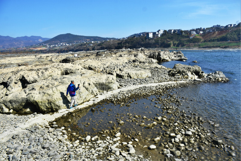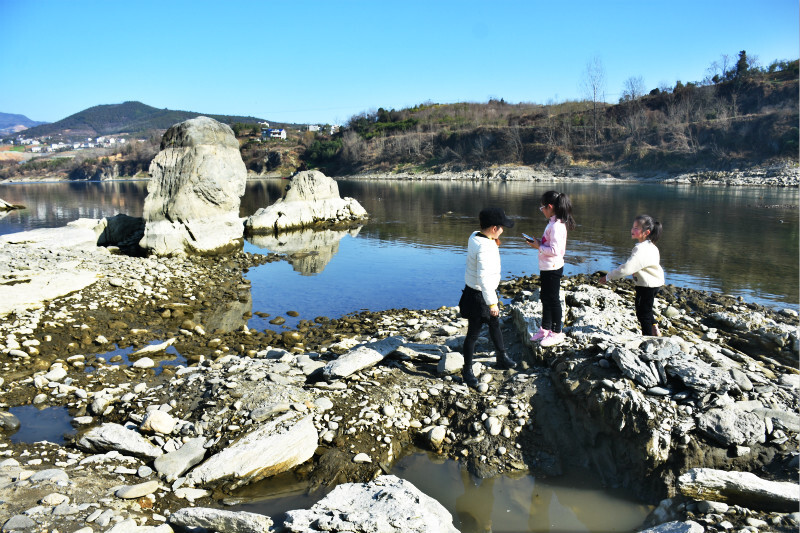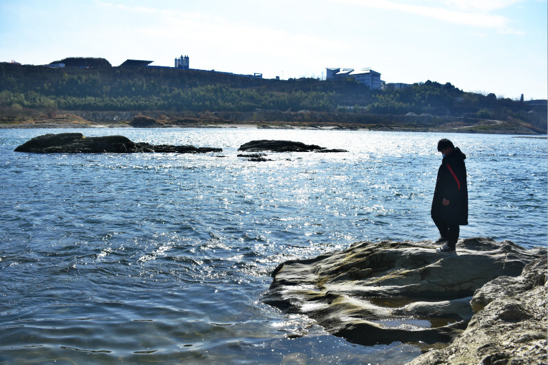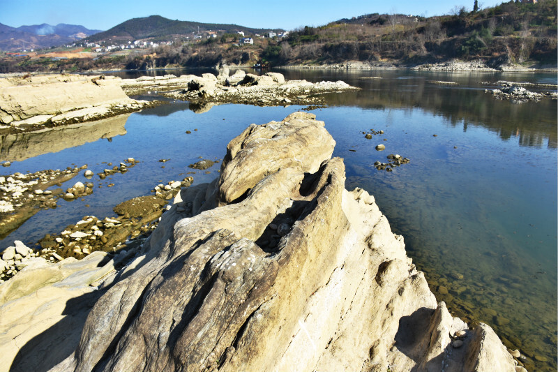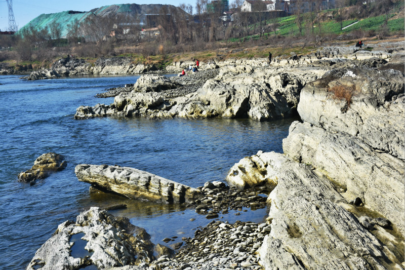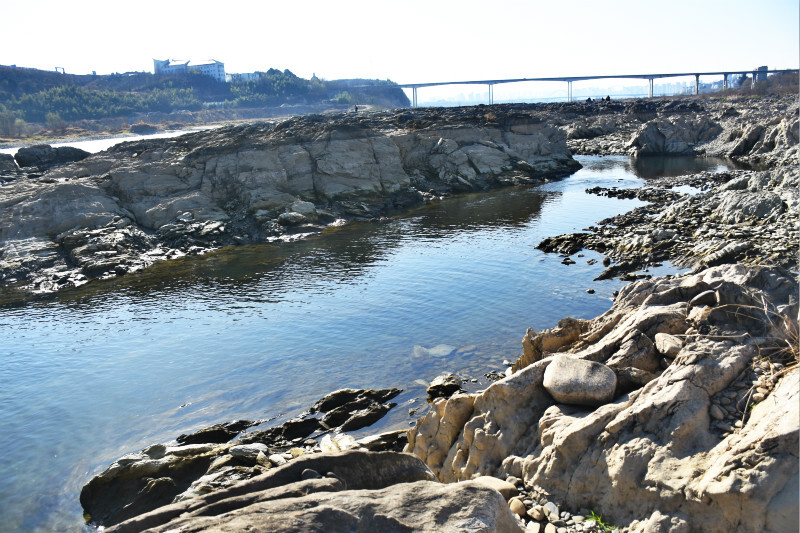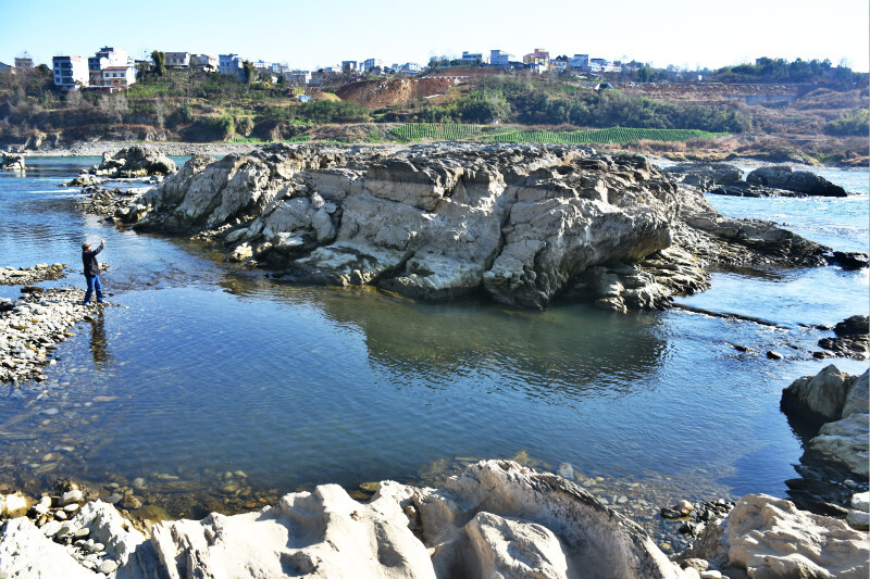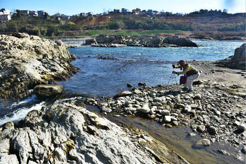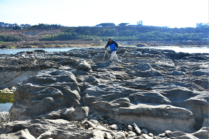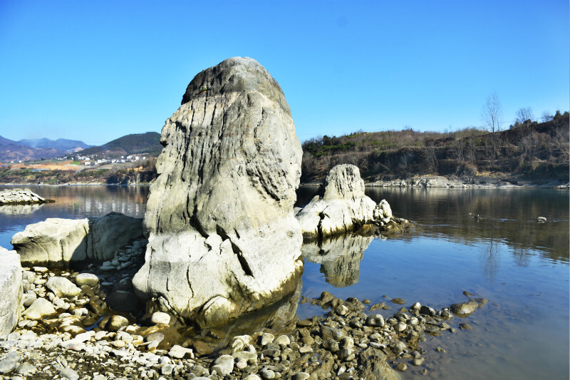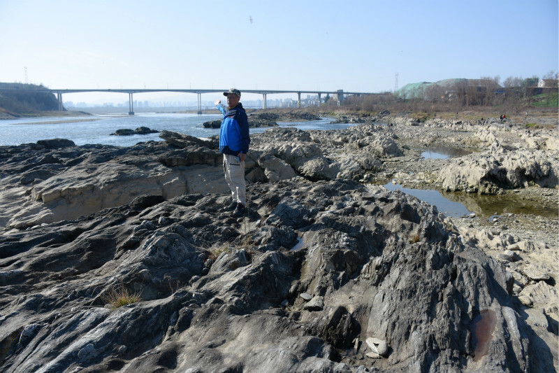 我到达这里是下午二点许,这里滔滔汉江更比我想像的伟岸和壮观。我们三个人沿着汉江底的河床石脊漫步和拍摄起来,河床底里裸露的汉江之底可谓奇石林立,而且枯水季节的汉江河床底里裸露着坚硬犹如磐石的几千年怪石,这些河床底石奇形怪状,犹如一条条巨龙俯卧盘踞在汉江河川里。河川里有许多游览玩耍的城里人,也有附近淘金的乡村人。奇才画家荆金水拿起一块奇石对我讲述如何寻找汉江奇石,他说你看哪一种奇石有用,适合观赏和在家里书房摆放?他给我指着外表圆润、形状好的石头说这种石头就没有任何价值,有价值和有用的石头搭眼一看就特别吸引人哩。就像你走在大街上偶尔发现美女一样,会令你心里一惊呢!说的我和高西岐呵呵笑了。我今天头一次跟着他学习了寻找汉江奇石的见识。他说汉江底裸露的石林有一些是五千年的原石、大多数是后来洪水冲击下来的巨石,并非原石呢。他拿着一块原石给我说,又指着河底的那些奇形怪状的裸露河床之石对我介绍,我算是明白了。