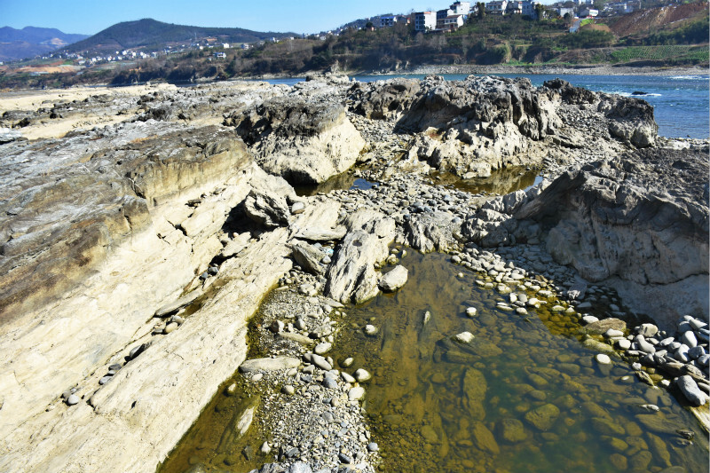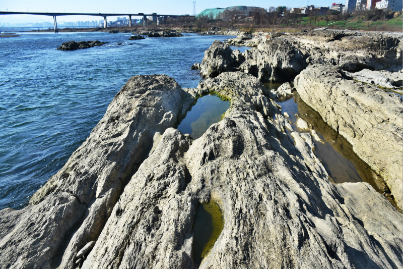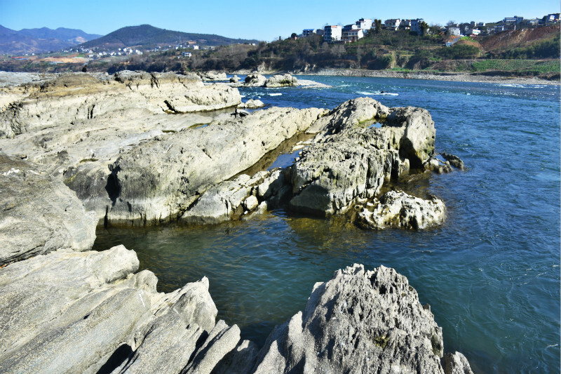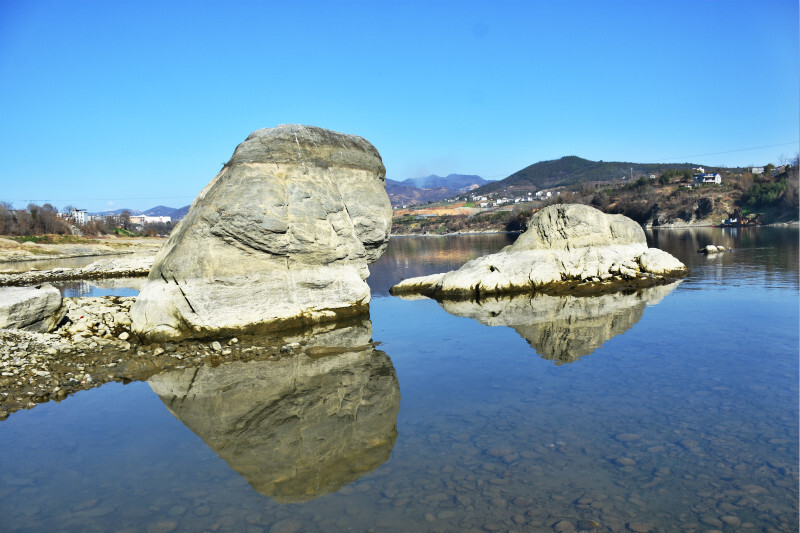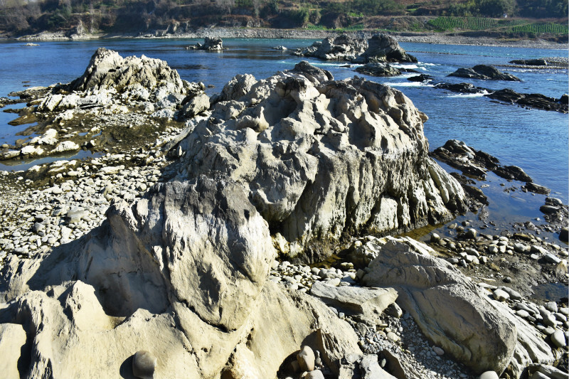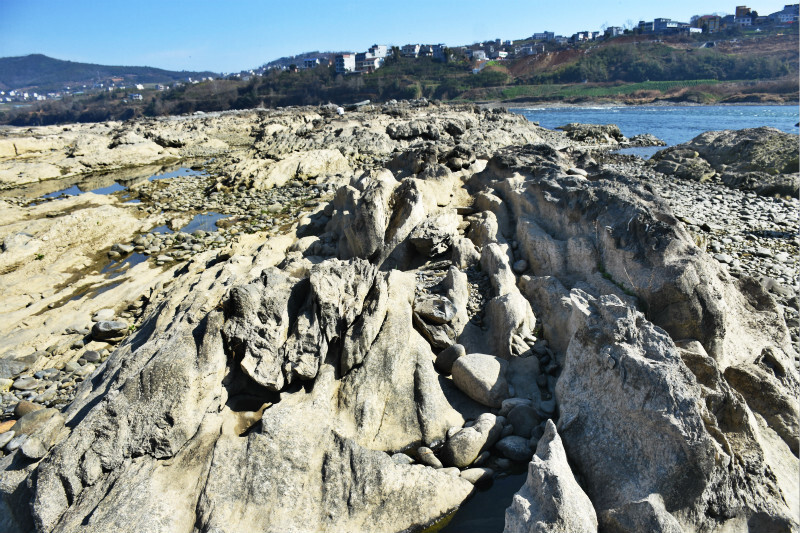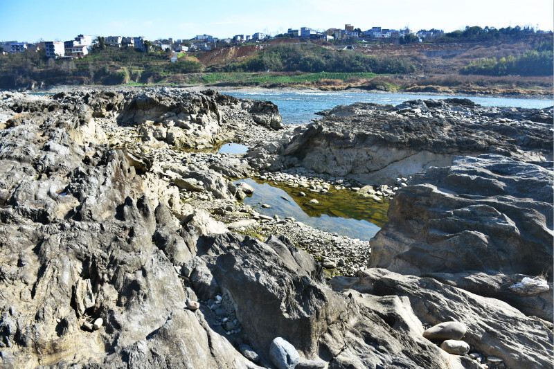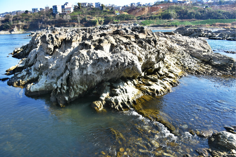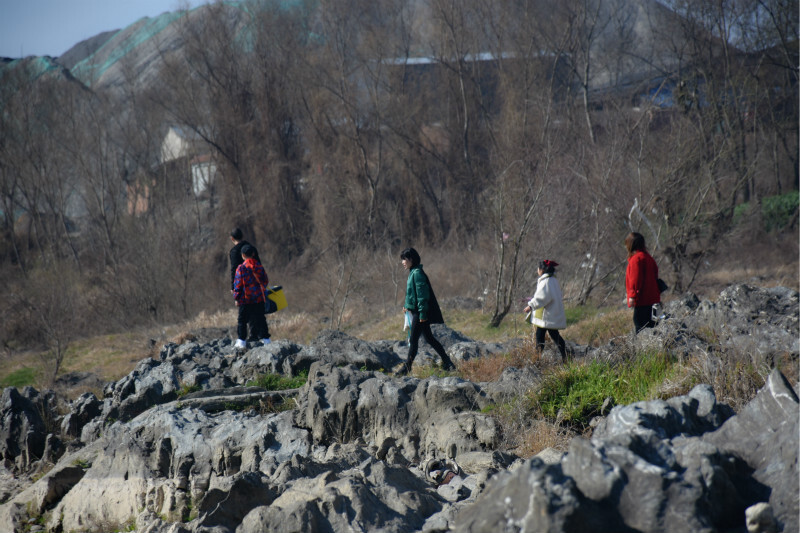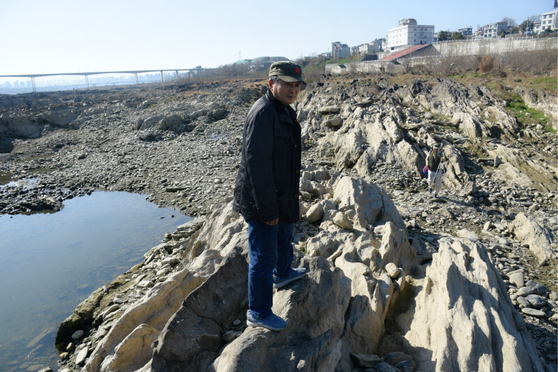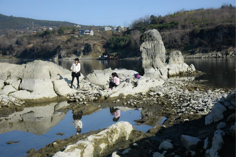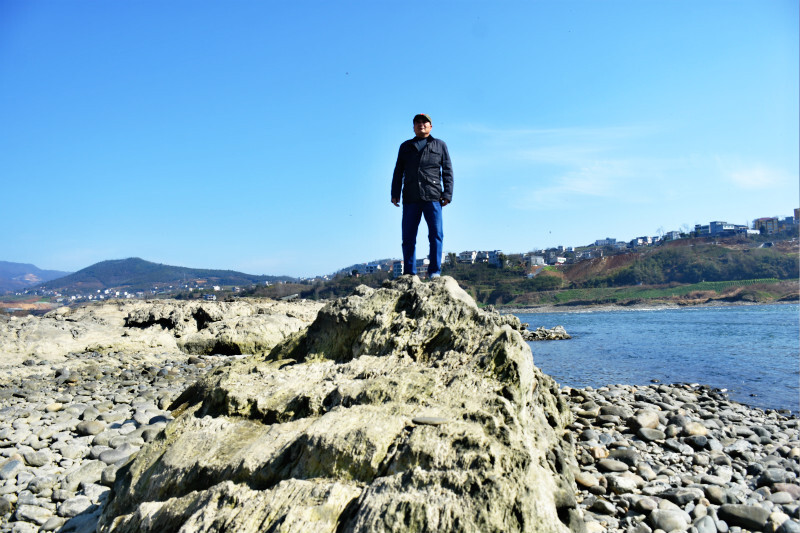 我到达这里是下午二点许,这里滔滔汉江更比我想像的伟岸和壮观。我们三个人沿着汉江底的河床石脊漫步和拍摄起来,河床底里裸露的汉江之底可谓奇石林立,而且枯水季节的汉江河床底里裸露着坚硬犹如磐石的几千年怪石,这些河床底石奇形怪状,犹如一条条巨龙俯卧盘踞在汉江河川里。河川里有许多游览玩耍的城里人,也有附近淘金的乡村人。奇才画家荆金水拿起一块奇石对我讲述如何寻找汉江奇石,他说你看哪一种奇石有用,适合观赏和在家里书房摆放?他给我指着外表圆润、形状好的石头说这种石头就没有任何价值,有价值和有用的石头搭眼一看就特别吸引人哩。就像你走在大街上偶尔发现美女一样,会令你心里一惊呢!说的我和高西岐呵呵笑了。我今天头一次跟着他学习了寻找汉江奇石的见识。他说汉江底裸露的石林有一些是五千年的原石、大多数是后来洪水冲击下来的巨石,并非原石呢。他拿着一块原石给我说,又指着河底的那些奇形怪状的裸露河床之石对我介绍,我算是明白了。