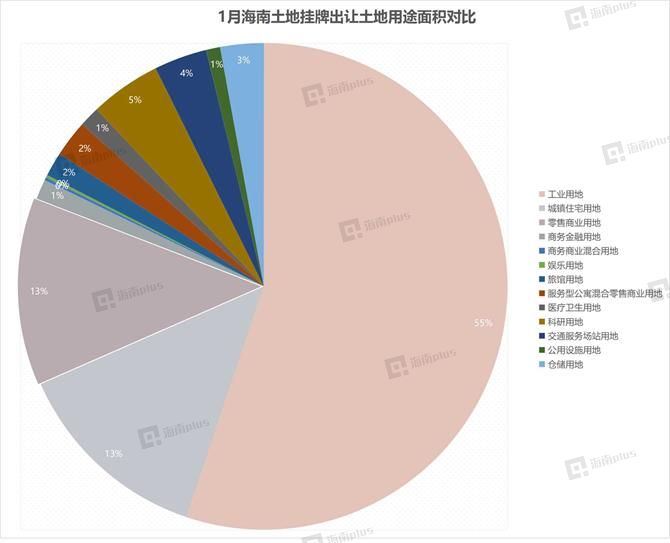1月,海南共挂牌出让31宗地,总面积107.3958公顷,从土地用途面积对比来看,工业用地占55%,占比大;城镇住宅用地与零售商业用地各占13%。