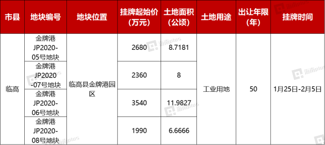 从各市县挂牌土地数据来看,临高挂牌出让土地面积远超其他市县,四宗地为工业用地,皆来自金牌港园区。