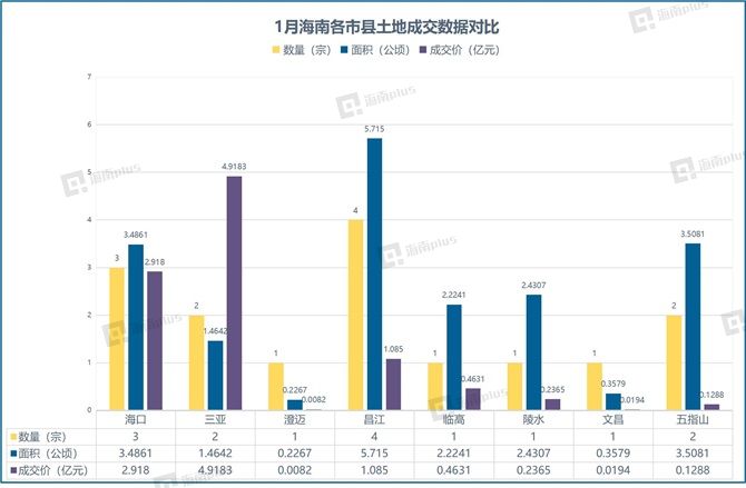 从各市县成交数据,昌江成交宗数及成交面积都排在首位,不过从成交总价来看,三亚地块依然是最具价值,其中,恒力集团以46495万元竞得三亚凤凰海岸片区YGHA06-03-16/17/18地块,也占据1月海南各地块成交价的榜首,该地块用于建设高端国际人才公寓和国际人才社区,配套社区医疗、幼儿园、社区商业服务等。