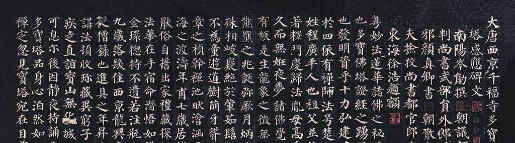 “多宝塔”是颜真卿44岁书写,目前见到的“颜大楷”看,是初期作品,这时颜书法度没有形成,在最显著的“钩”的笔法上,用推钩,沿袭古法;在结体上,已略有“宽博”之势,但缺少变化,尤其是横画,多有“平行”之板状。因之,启功先生说《多宝塔碑》款署颜公,而字体与颜书诸碑俱不类。吾见中唐人写经,卷外题签。笔力厚重,“间隔紧密每神肖此碑,知此必当时经生所书耳”。