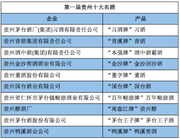 2011年,为培育贵州白酒优势品牌,贵州省曾评选了第一届贵州十大名酒。2016年,由贵州省酿酒工业协会组织实施了第二届贵州十大名酒评选活动。