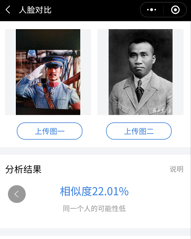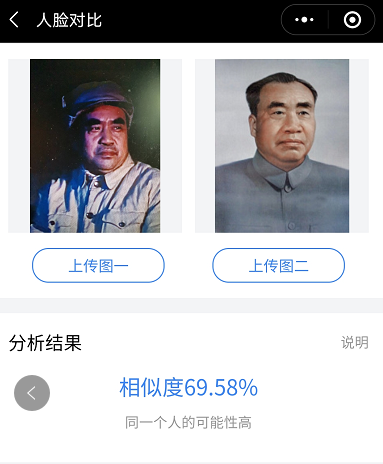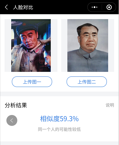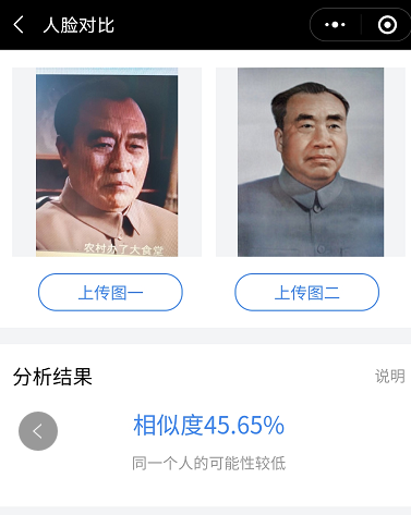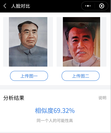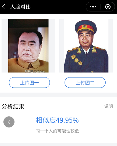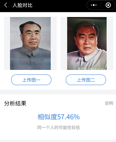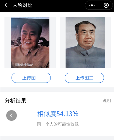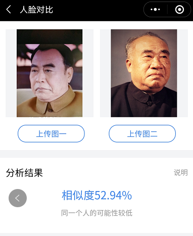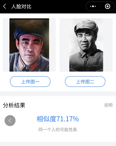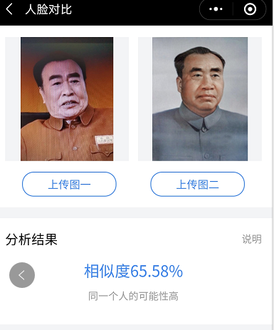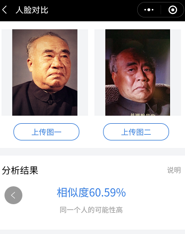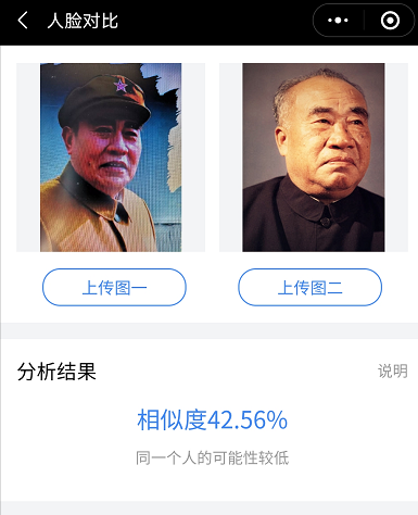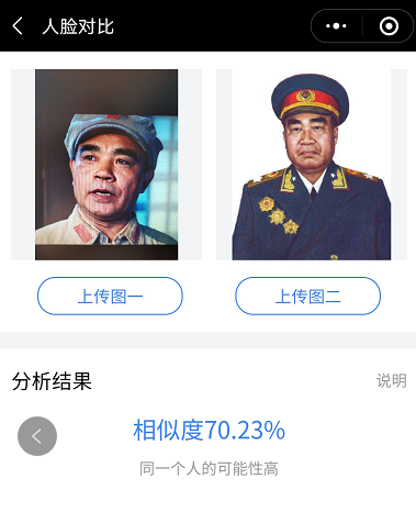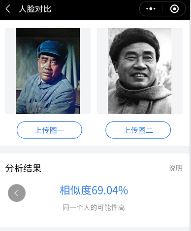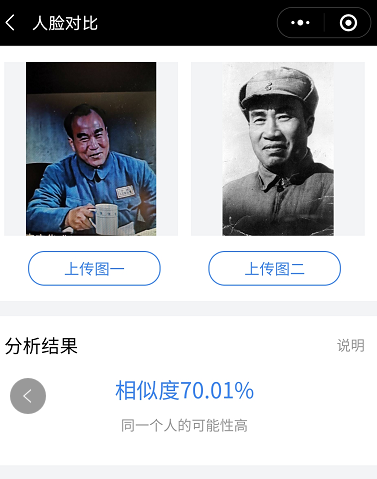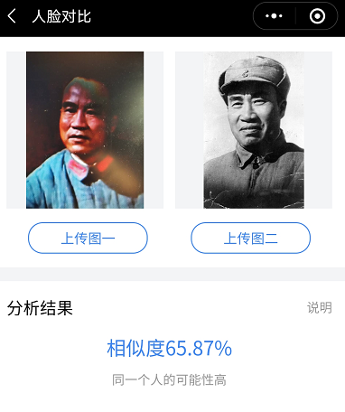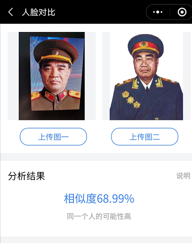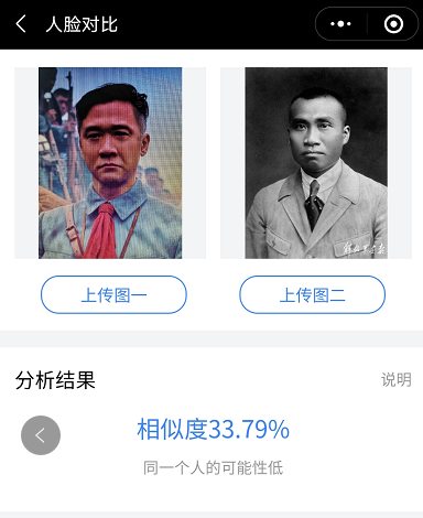 几乎在绝大多数刘怀正的形象与人物原型比对中,“人脸对比”技术都认定两个人是同一个人,也就是说刘怀正与朱德的形象相似值达到了匪夷所思的高度吻合。