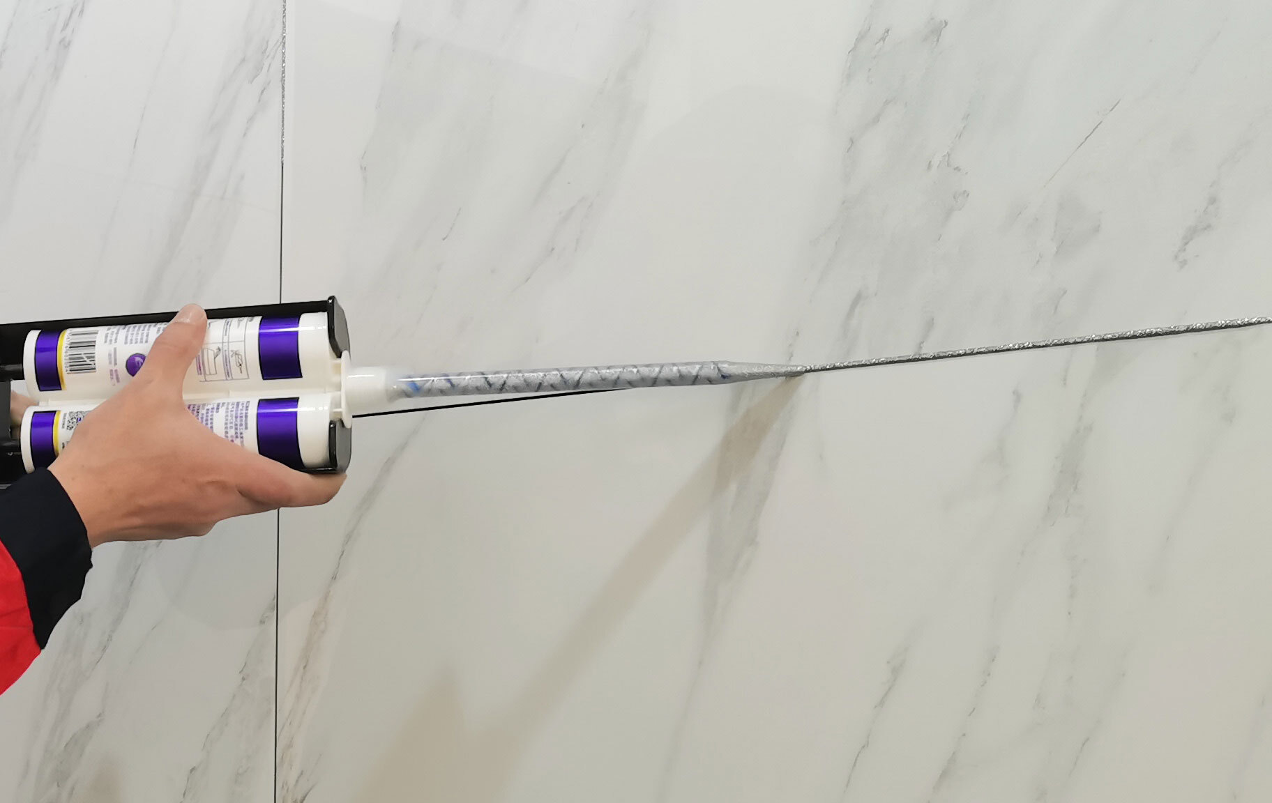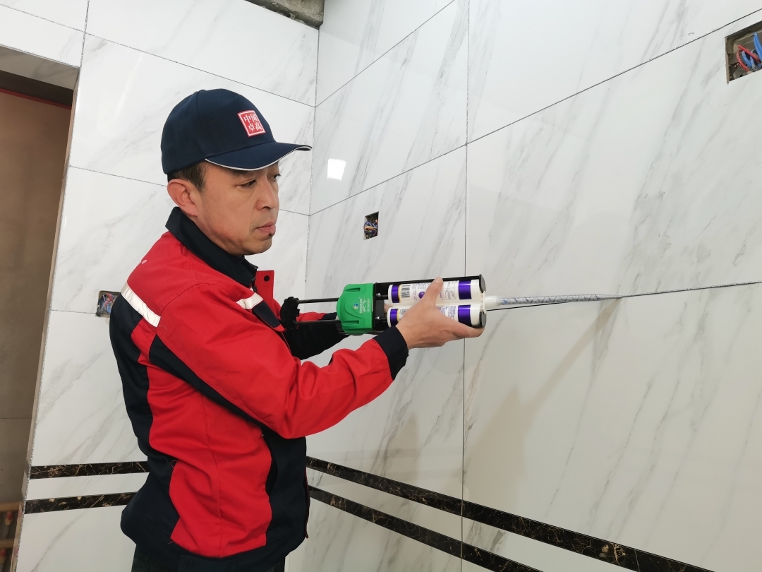 5、施工时千万不要因为节省而刻意减少用量,建议大家每次打入的美缝剂要高于瓷砖表面2mm,利于压缝。