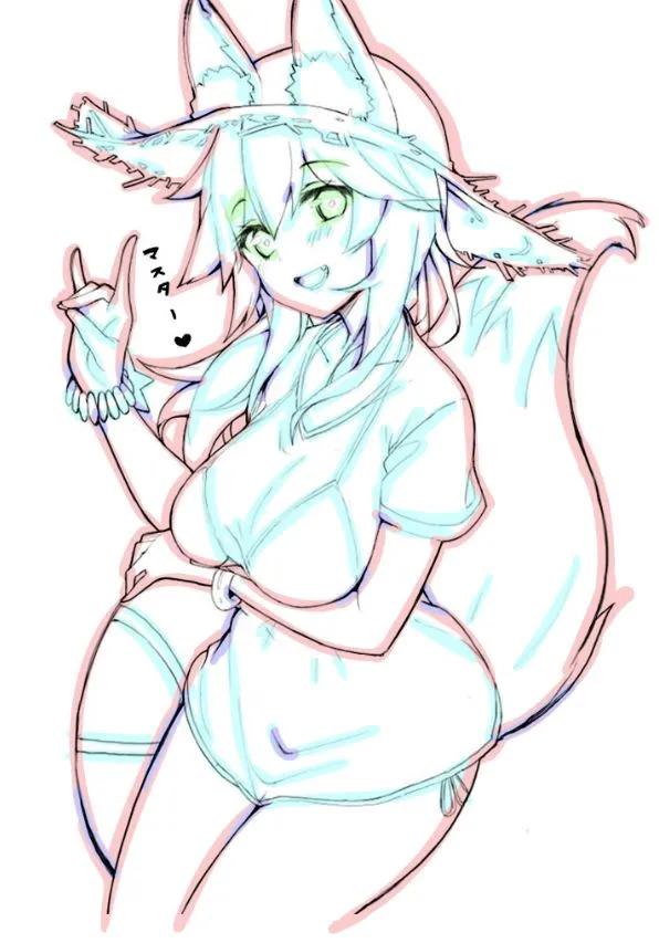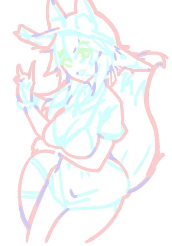3、细化草稿,尽量把所有的内容都完整地画出来。(这里胸前的线条比较多,用手绘板的话,还可以把围巾像这样换一个颜色,就会比较清楚)