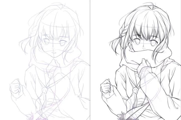 我们看左图这张线稿跟结构都还画不清楚,线条的层次也不够分明。如果有同学手绘画成这样,建议还是换成板绘练习会更高效~