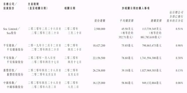 2020年11月18日,合生创展(0754.HK)发布公告披露了过去一年的炒股投资版图。合生创展的投资标的主要为科技公司,从2019年底开始,在公开市场大手笔买入新加坡互联网企业SeaLimited(SDRL.N)、小米(1810.HK)、平安保险(2318.HK)、汇丰控股(0005.HK)以及中国移动(0941.HK)等公司的股份,累计斥资逾64亿元。