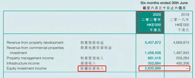 近年来,合生创展负债压力较大,销售业绩表现也差强人意,不过自朱桔榕接班一年以来,其股权投资倒是风生水起。财报显示,2020年上半年,合生创展收入突破107亿港币,较去年同期的72亿港币大幅增加近50%,而业绩增收几乎都来源于2020年来新增的“股权投资收入”。
