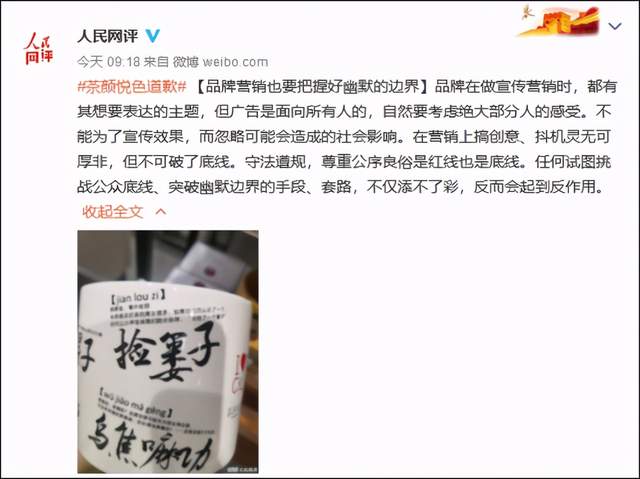 值得一提的是,在茶颜悦色道歉后,人民网网络评论部官方微博也于20日就此事发表评论。@人民网评表示,品牌在做宣传营销时,都有其想要表达的主题,但广告是面向所有人的,自然要考虑绝大部分人的感受。不能为了宣传效果,而忽略可能会造成的社会影响。
