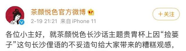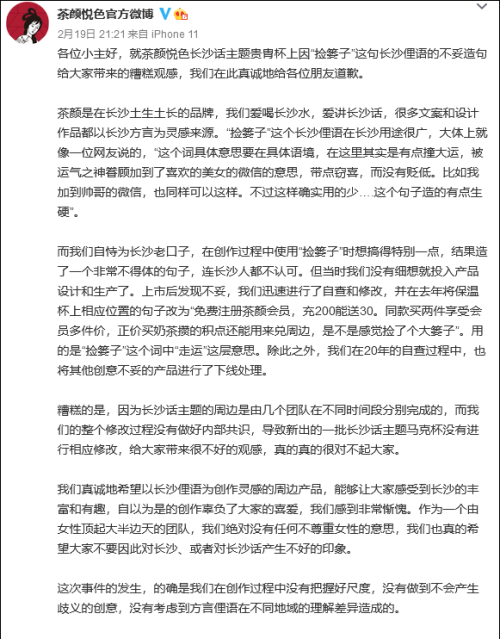 “我们很惭愧。”2021年2月19日晚,茶颜悦色在微博致歉,并表示将立即召回该批长沙话主题马克杯。