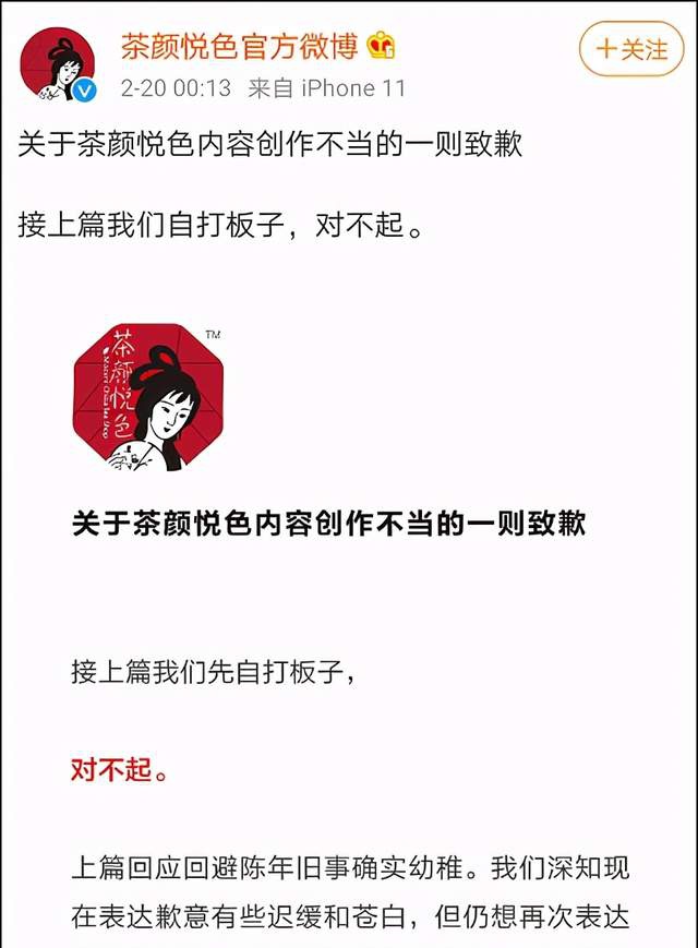 但由于该篇声明只对长沙话主题杯的创作进行回应,茶颜悦色又被网友指责“避重就轻”,不谈其他有问题的产品。因此,在20日凌晨,茶颜悦色再发一则“关于茶颜悦色内容创作不当”的致歉公告,称“回避陈年旧事确实幼稚”,他们接上篇继续“自打板子”。