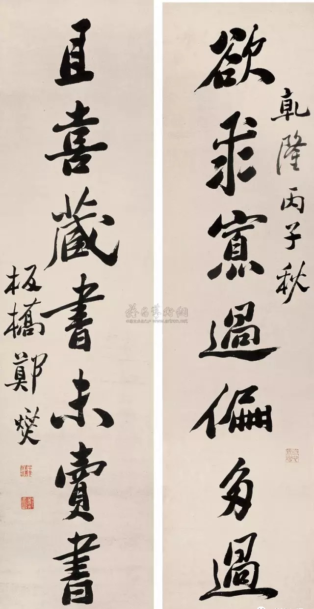 郑燮(1693~1765),字克柔,号板桥、板桥道人、风子、樗散人、红雪山樵等,江苏兴化人,著有《板桥全集》。他以画竹著称于世,又对传统行草有相当的造诣,但因世人好奇,遂不满于此,而有意以篆法、隶书、楷书与行草杂糅,自称“六分半书”,这种探索精神当时即为他博得了很高声誉,但是由于篆隶本身的复兴并不充分,事实上融合篆隶楷行草于一体的时机并不成熟,因而板桥的作品,往往是一种偏于简单的拼凑,无法深入到其精神实质,故总体上并不成功。但他的影响,对于人们重视篆隶的审美价值,仍然是有重要的推动作用的。