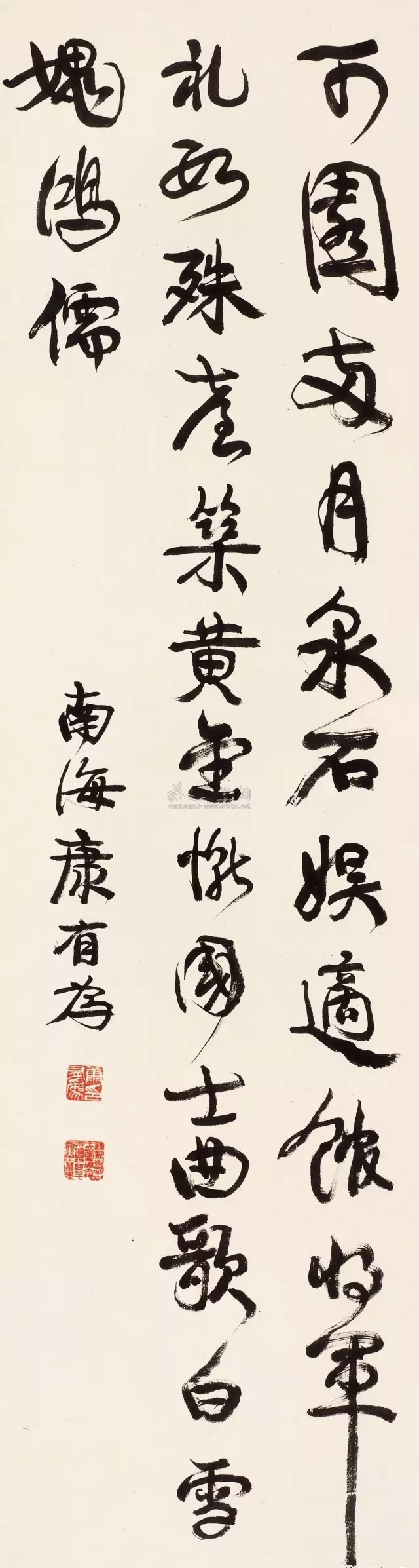 康有为(1858~1927),初名祖诒,字广厦,号长素、更生、西樵山人等,广东南海人,著有《康南海先生遗著汇刊》、《万木草堂遗稿》、《万木草堂遗稿外编》、《广艺舟双楫》等。康有为是碑学理论的健将,持论时有偏激之见,往往为人所诟病,但他自幼曾受过严格的传统书法训练,虽然以后专修北碑,但幼学基础仍然未废,结果无意中形成了碑帖融合的面目。前人多认为他的书法出自《石门铭》,实际上还有许多颜真卿行书的趣味。因此他的书作既有北碑的开张恣肆、篆隶书法的古朴雄浑,又有传统行草的酣畅飞动,是篆隶北碑与传统行草融会贯通比较成功的例子。
