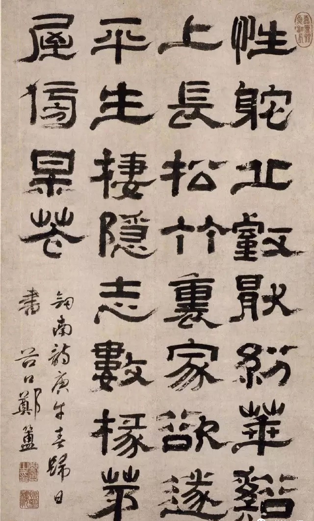 邓石如(1743~1805),初名琰,字石如,避嘉庆帝讳,以字行,改字顽伯,号完白、完白山人、古浣子、完白山民、游道人、龙山樵长、凤水渔长、笈游道人等,安徽怀宁人。他生于乡鄙,终生为布衣,但自幼即喜刻石,仿汉印颇工,至南京梅镠家,居八年,遍临所藏金石善本,由此而篆、隶、楷、印皆臻大成之境。乾隆五十五年入京,刘墉延为宾客,声振当代名公。其篆书融秦汉于一炉,又出以隶笔,遂使篆法活脱生动,摆脱了铁线的拘滞,不唯字形阔大磅礴,而且笔势丰富多姿,墨色流溢灿然,大大拓展了篆书的艺术表现力。其隶书笔致健拔苍劲,结体疏宕俊逸,用墨苍古,亦可谓深入汉人堂奥。晚清书论名家包世臣、康有为、杨守敬等对他无不推崇备至,竞相推许为国朝第一、集篆书大成等。这都是因为他成功地实现了两大传统的转换,表明酝酿已久的秦汉北碑传统的复兴高潮的来临和两大传统的对峙、融会的真正的开始。