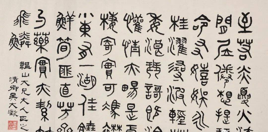 吴大澂(1835~1902),原名大淳,避帝讳而改,字止敬,又字清卿,号恒轩、愙斋等,江苏吴县(今苏州)人。同治七年(1868)进士,累官至广东、湖南巡抚。好集古精鉴别,是著名的金石学家,所得古器皆手自摩拓,工书画篆刻,著有《愙斋集古录》、《愙斋集古录释文誊稿》、《说文古籀补》、《恒轩吉金录》、《古字说》、《古玉图考》、《愙斋诗文集》等著作。他的篆书融会大小二篆,以大篆立其筋骨,以小篆敛其体裁,而笔墨又极其精炼,三美归一,形成了坚劲紧韧的艺术风格,为篆书艺术开辟了一种新风格。