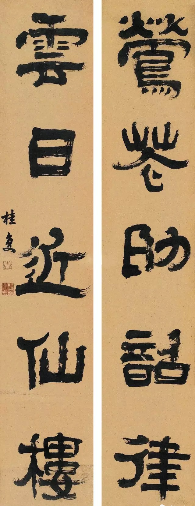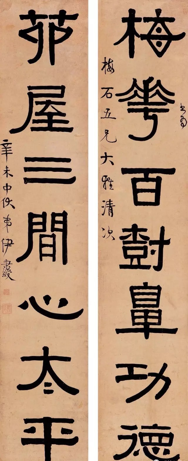 与“八怪”相先后的,还有一批精于篆刻或字学的艺术家,对篆隶进行了更加纯粹同时也更加深入的探讨钻研,从而比较成功地使篆隶的生命力得到全新的激发。代表性书家有丁敬、黄易、钱坫、桂馥、邓石如、伊秉绶等。特别是桂馥、邓石如、伊秉绶,真正站到了历史演变的制高点上,使秦汉传统的复兴进入了一个全新的境界。
