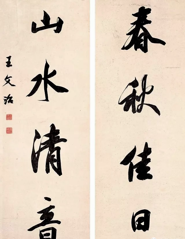 王铎行草的章法极有特色,倪后瞻说他“以力为主,淋漓满志,所谓能解章法者也”。一般行距大、字距紧,行内因笔法和字形的复杂多变而呈现跌宕起伏的变化,如蜿蜒巨龙腾飞纸上,神妙夭矫,不可端倪,有气贯长虹之势,无轻媚流滑之弊,古韵今情,和合一体,令人目眩神驰、胸豁气畅,开行草书的一种新境界。