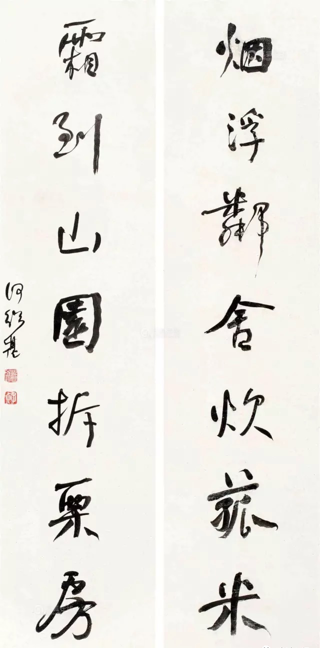 他最有影响的是行草书,晋唐宋兼综,融汇极广泛,又有自己的鲜明特色。行书深得《集王圣教》和米芾的精神,在大幅式上纵横驰骋,创造了独特的形式和意味。其书点划粗者,重似千钧;细者既如游丝,也筋力坚韧;有时用涨墨法,形成浓重的墨块,宛如巨石,得厚重之致。结构茂密雄放,或紧结蹙缩,或开拓纵逸,跌宕多姿,无不如意。