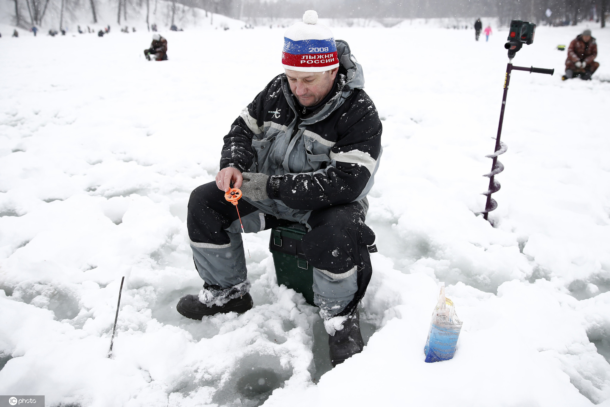 当地时间2021年2月21日,俄罗斯莫斯科附近的谢尔吉耶夫,当地举行冬季捕鱼节,民众参加冰钓活动趣味十足。