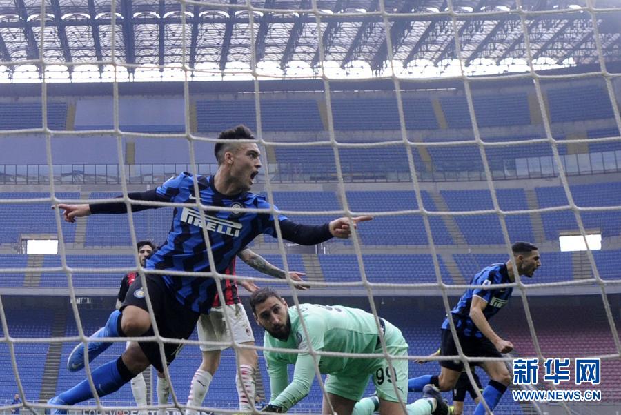 2月21日,国际米兰队球员劳塔罗·马丁内斯(左二)在比赛中头球破门。 当日,在2020-2021赛季意大利足球甲级联赛第23轮比赛中,国际米兰队客场以3比0战胜AC米兰队。 新华社发(阿尔贝托·林格利亚 摄)
