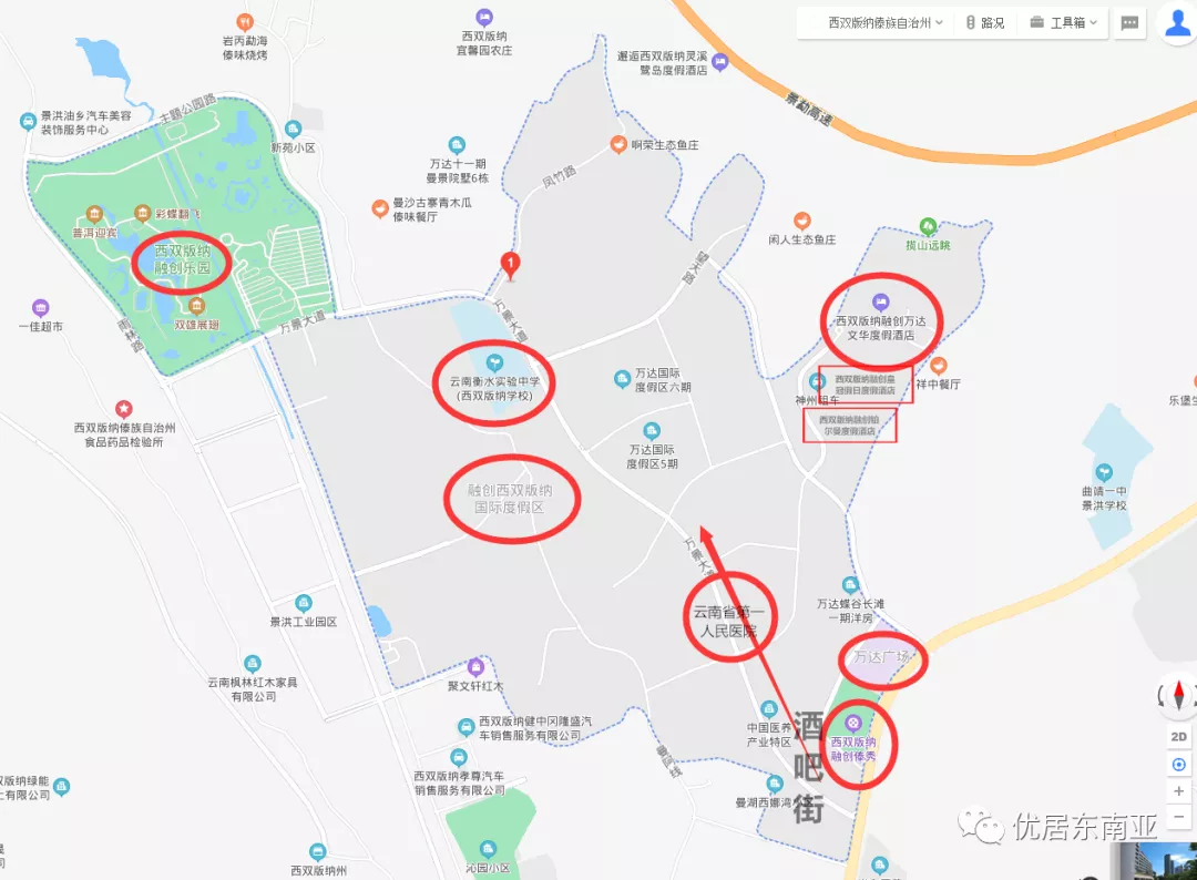 包含主题乐园、傣秀剧场、酒吧街、万达广场、高端酒店群、三甲医院及中小幼教育配套圈,完全是超前的全业态同时开放的文化旅游城。