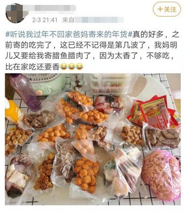 其实,今年还是有很大变化的,因为有1亿多人选择就地过年,没能回到家乡,后备箱里的爱就变成了父母寄来的各种年货包裹,来自家乡的猪羊牛肉、饺子、咸鸭蛋等可以塞满整个冰箱。