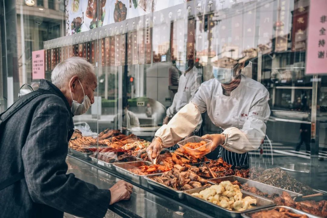 临近云南南路的路段,老字号的门前总是特别熙熙攘攘。吃块炸猪排、买个条头糕,尽显海派市井的烟火气。