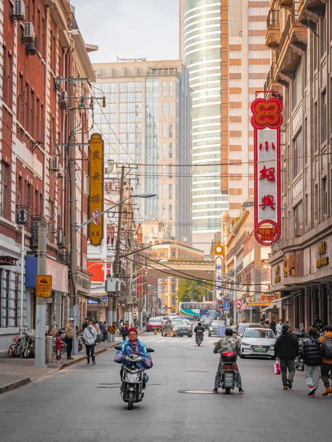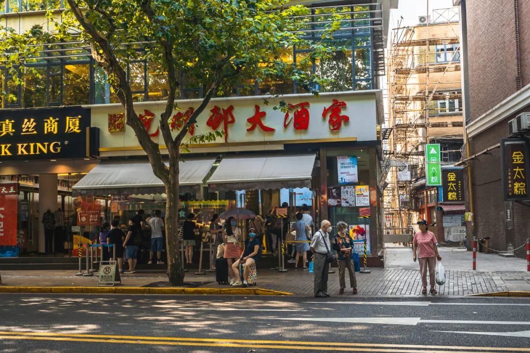 往前走便是那些陪伴阿拉长大的老字号品牌:第一食品商店、新雅粤菜馆、老大房......姆妈们年轻时候爱逛的上海时装商店、永安百货,如今依旧人流不减。