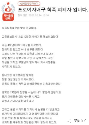2月10日凌晨,一位匿名网友在韩国知名论坛上发表了一篇名为《我是现役女排选手学生时代暴力的受害者》的文章,尽管文章中未提及霸凌者的真实姓名,但诸如“你们两个”的表述不得不让人怀疑肇事者就是李多英和李在英,姐妹甜心秒变姐妹恶霸。