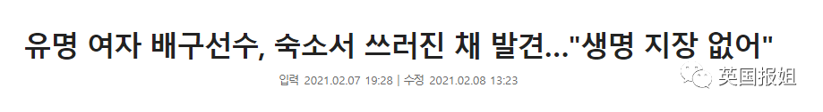 2月7日,据多家韩媒报道,韩国女排知名球员A在球队宿舍晕倒。发现人表示:“A好像尝试了极端的选择”,也就是自杀。好在A被及时送往医院治疗,并无出现生命危险。所在球队也只说是因为腹痛而晕倒。