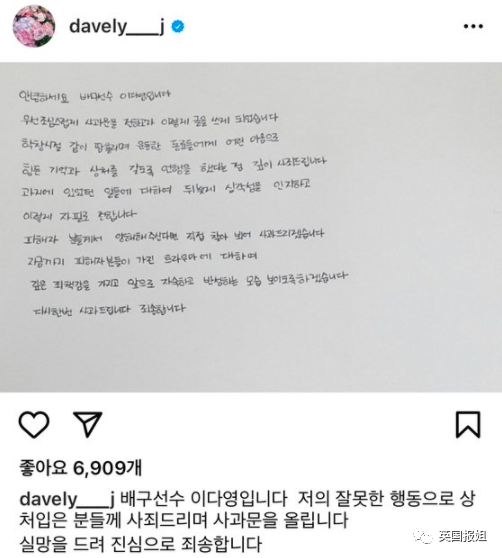 这篇揭露“排球甜心”暴行的文章创下34万多的点击率。事情越闹越大,再也兜不住了,于是当天下午,李多英就在IG上传了一封手写道歉信,表示自己正在深刻反省,承认了霸凌事实。