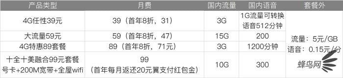 注:文中表格如无特别说明,则月费栏单位为“元”、流量栏单位为“GB”、语音栏单位为“分钟”,短信栏单位为“条”。
